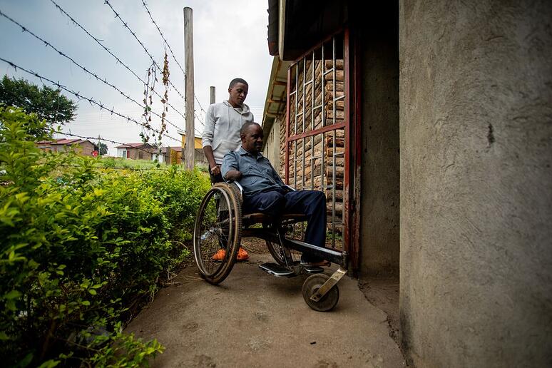 “Ik verloor mijn armen en benen tijdens een ongeluk. Ik werkte aan de aanleg van een weg, hier in de buurt van Fort Portal. De machine die ik bestuurde kreeg kortsluiting. Ik werd geëlektrocuteerd. In het ziekenhuis werd ik wakker zonder onderarmen, met één geamputeerd been en een ander been dat ik niet meer kan gebruiken. Ik was toen twintig jaar.