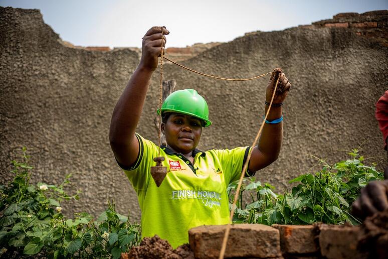 Vrouwelijke metselaar Naume Tweheyo aan het werk op een bouwplaats.